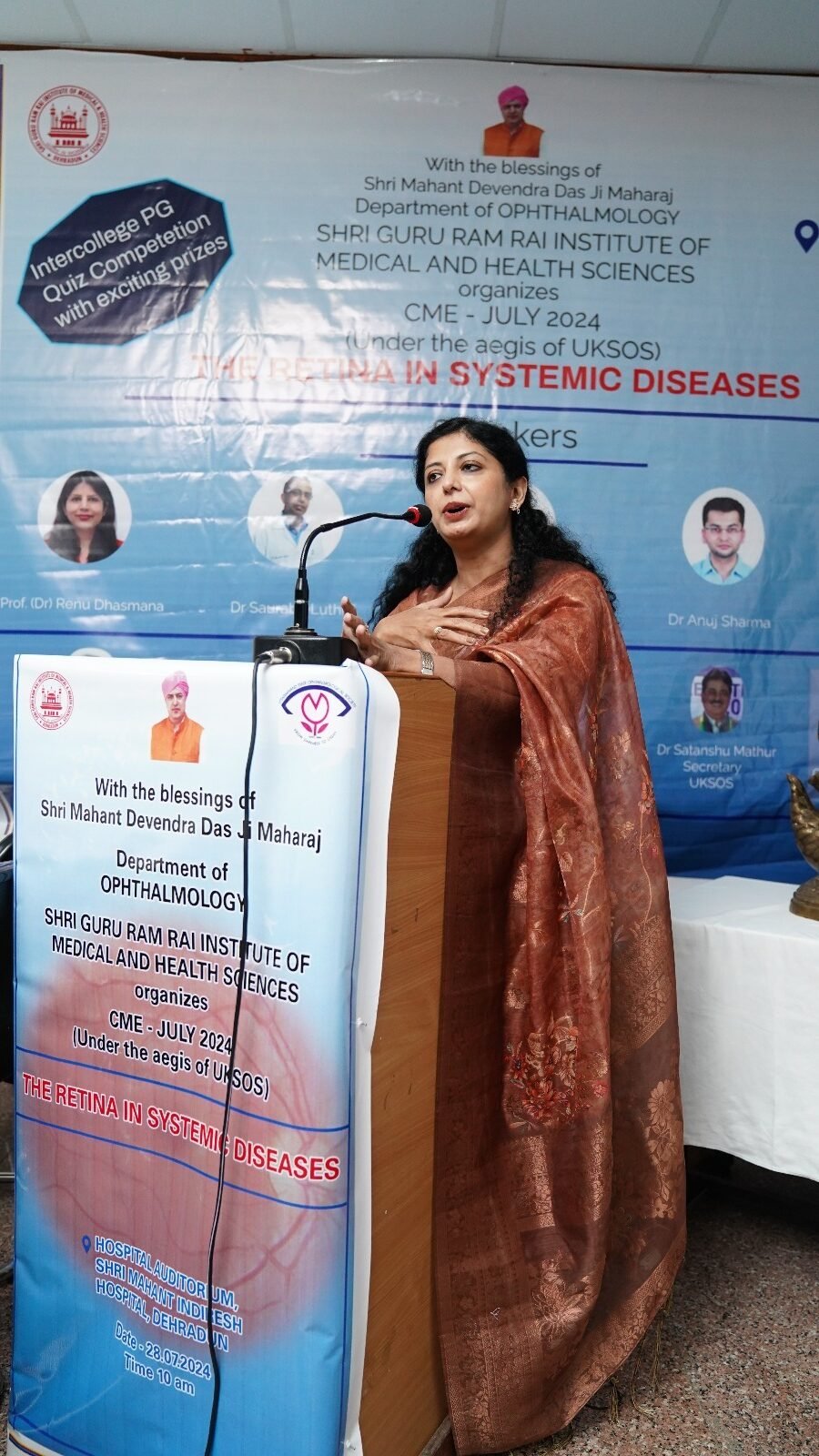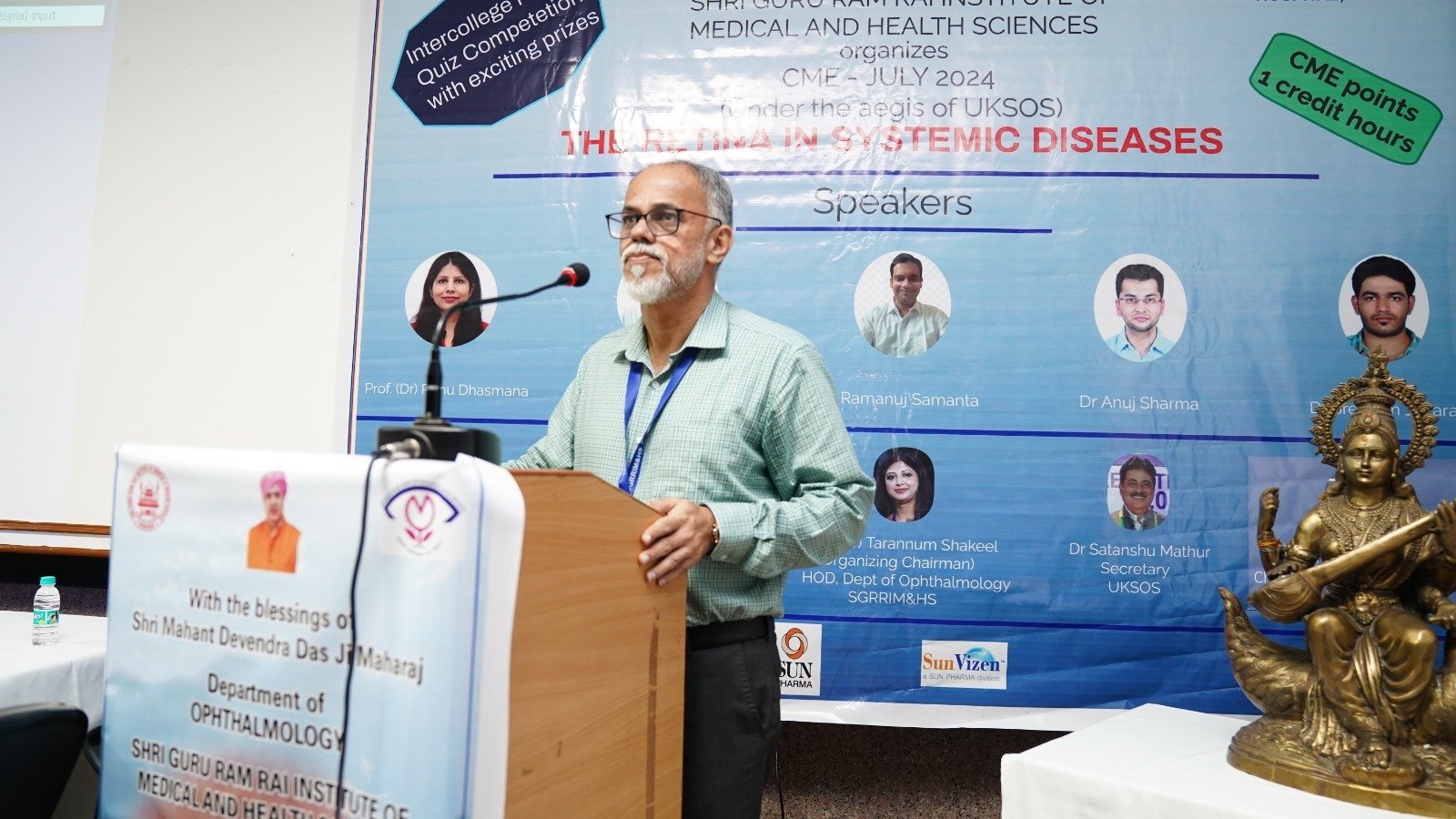 श्री महंत इन्दिरेश अस्पताल की नेत्र रोग विभाग की डॉ. प्रकृति पोखरियाल ने स्वागत अभिभाषण दे कर सभी प्रतिभागियों का स्वागत किया। उन्होने कहा कि इस सी.एम.ई. कार्यक्रम उद्देश्य आँखों के रेटिना( पर्दे) की बीमारियों को शुरूआती स्तर पर ही पहचानना व उसके मरीजो को सर्वश्रेष्ठ उपचार की विभिन्न विधियों पर मंथन व ज्ञानवर्धन करना हैै। कार्यक्रम का शुभारंभ प्राचार्य, एसजीआरआरआईएण्डएचएस, डॉ. अशोक नायक, कुल सचिव, शोध एवं विकास, श्री गुरु राम राय विश्वविद्यालय, डॉ. पंकज मिश्रा, प्रेसिडेन्ट, यू0के0एस0ओ0एस0, डॉ. विनोद अरोड़ा व विभागाध्यक्ष नेत्र रोग विभाग श्री महंत इन्दिरेश अस्पताल व कार्यक्रम की आँग्रेनाईजिंग चेयरपर्सन डॉ. तरन्नुम शकील के द्वारा संयुक्त रूप से दीप प्रज्जवलन कर किया गया। डॉ. अशोक नायक ने अपने सम्बोधन में कहा, इस तरह के सी0एम0ई0 कार्यक्रम ज्ञान के आदान प्रदान के लिए आदर्श मंच हैं। उन्होंने कहा कि एसजीआरआरआईएण्डएचएस इस तरह के आयोजनों को समय-समय पर करवाता रहा है।